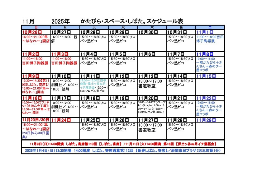 お茶カフェ&お茶販売、落語会、日本酒バー、演劇、音楽ライブ、書道教室、ソロバン教室、花のワークショップ、ストレッチ、ヘッドスパ、国語塾、ロボット教室、会議利用と様々。